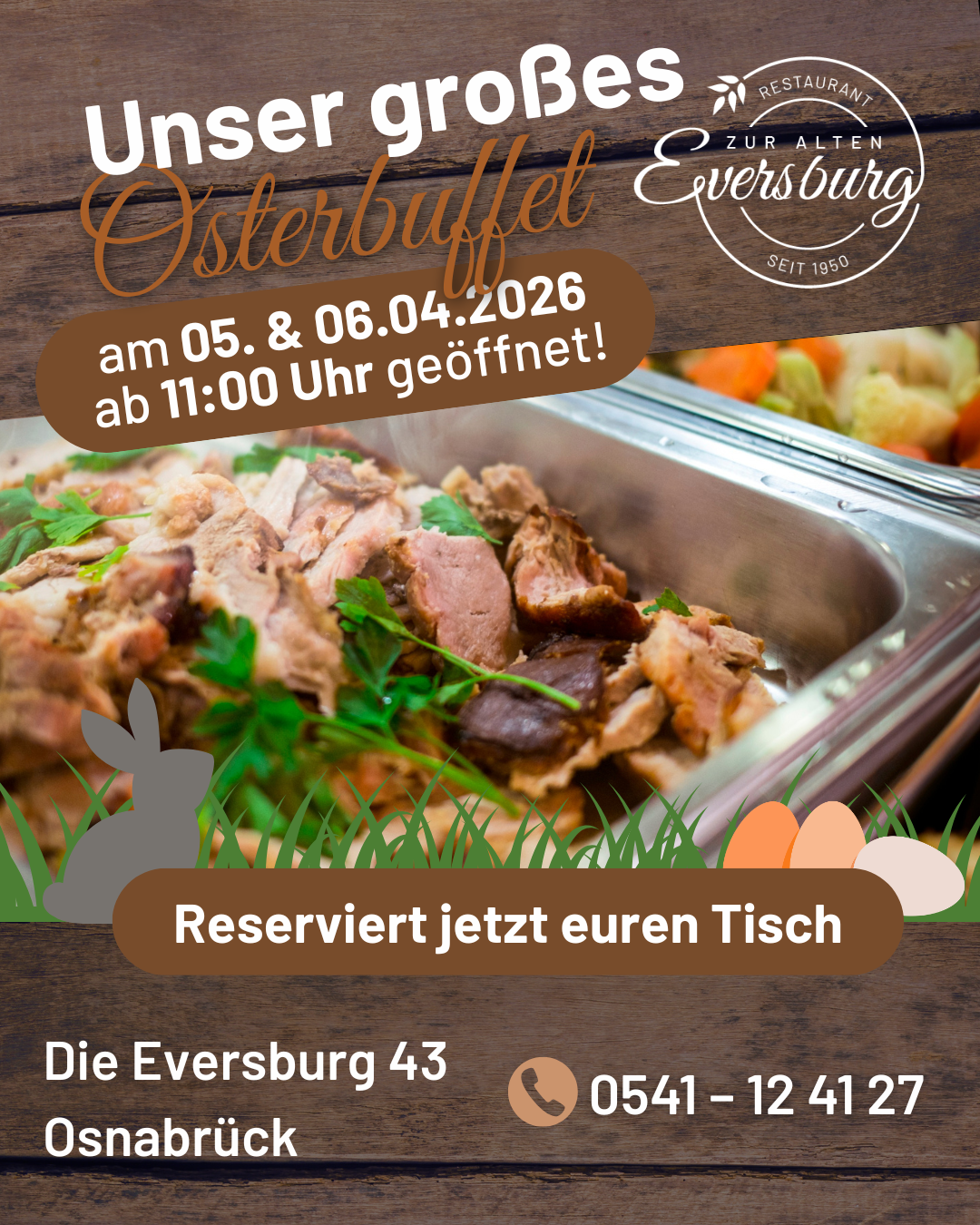 An beiden Ostertagen (5 & 6. April 2026) bieten wir euch ein großes Osterbuffet an, welches 4 Gänge beinhaltet.